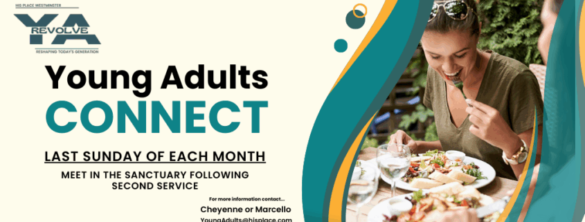 Join our Revolve Young Adults as they grab lunch every Sunday of the month after second service. Meet in the sanctuary right after second service ends and go fellowship together over some good food. Contact Cheyenne or Marcello for more info at [email protected].